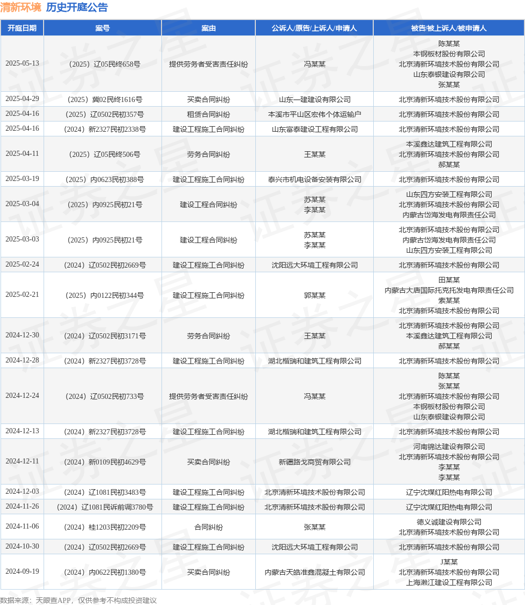 案号:(2025)辽05民终658号审理法院:辽宁省本溪市中级人民法院案由:提供劳务者受害责任纠纷当事人信息: 原告/上诉人:冯某某 被告/被上诉人:陈某某、本钢板材股份有限公司、北京清新环境技术股份有限公司、山东泰银建设有限公司、张某某开庭日期:2025年5月13日根据统计,近一年内以北京清新环境技术股份有限公司为当事人的历史开庭公告有29则,其中案由为“建设工程施工合同纠纷”的公告以11则居首,其次为“买卖合同纠纷”有6则,“追索劳动报酬纠纷”有3则。历史开庭公告(前20条)如下: